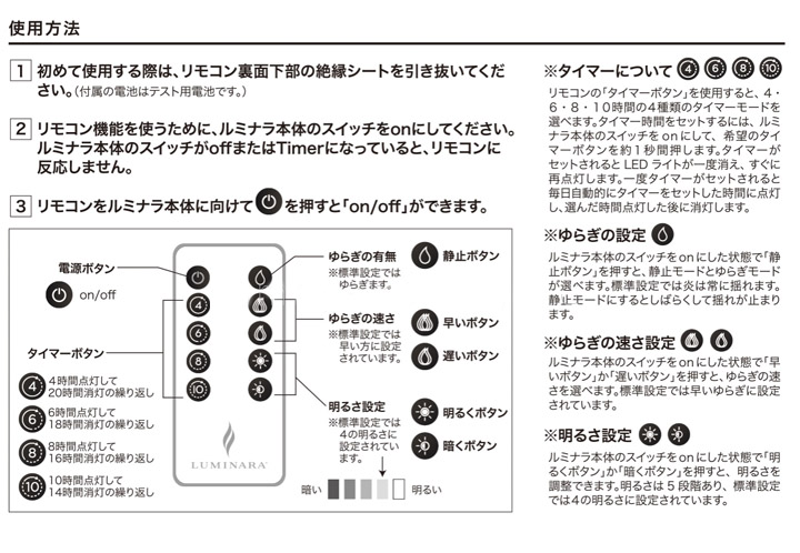 ・日本語説明書付き ・ ルミナラ本体底面の電池カバーにリモコンマークがついているルミナラのみ対象。 マークがついていないルミナラでは、電源のon/offのみ使用できます。 ・通常5~6m程度の距離で使えますが、角度によっては2~3mとなる場合があります。 |