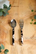 | サーブル パリのビストロ デューン ブラック ケーキフォーク、ティースプーン。 使いやすさと美しさが計算された流れるようなスリムなフォルムと、透明感のあるマーブル模様の柄が特徴的。 Duneシリーズのデザートカトラリーは、テーブルカトラリーと同じ形でサイズだけが小さくなっているので、華奢になりがちなデザートカトラリーも持ったときにしっかりとした安定感があります。 少し大きめのケーキフォークは、ひとくちを大きく楽しみたいデザートにもぴったりです。 また少し大きめのティースプーンは、ババロアやプリンなど、大きくすくって楽しみたいデザートにもぴったりです。 ※8本までネコポス可(他のブランドのカトラリーと同梱可) ![]() ブラックは、白と黒のマットな色味のコントラストと、透明感のある茶系のマーブル模様が目を引き、モダンでエレガントな印象です。 色のコントラストが印象的でありながら、温かみのあるアイボリーや透明感のある茶系の色味が柔らかさをそえて、存在を主張しすぎず、日常にも使いやすいシリーズです。 ![]() 柄の部分のマーブル模様のアクリル樹脂は、生地のとり方によって、商品一つ一つ模様の出方や、黒、アイボリー、中間色など色目の出方も変わってきます。 色味や模様によって同じシリーズでも印象が違うこともございますが、製品の特性として、ご理解をいただけますようお願いいたします。 ![]() 柄の部分は、ステンレス製のカトラリー本体が大理石のようなアクリル樹脂の板でサンドイッチされ、3つのリベットで留められています。 リベットの意匠やサイドからのぞいている金属部分が、エレガントな大理石模様の柄にほどよくモダンで機能的な印象を加えています。 |