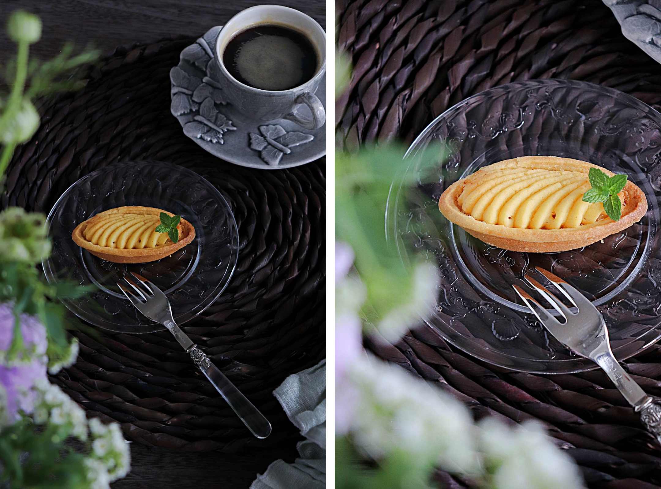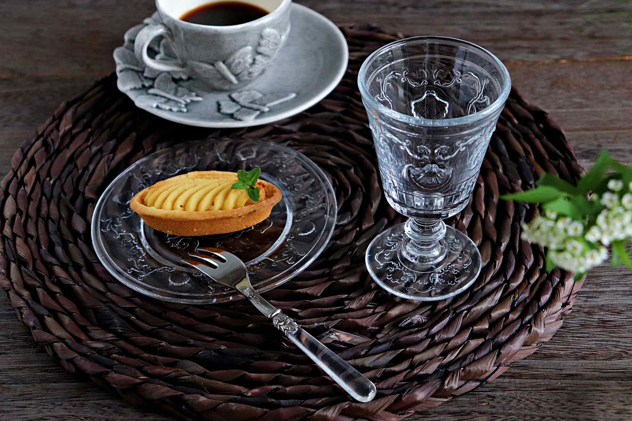 デザートや焼き菓子をのせると、ガラスのレリーフが料理を美しく引き立てます。