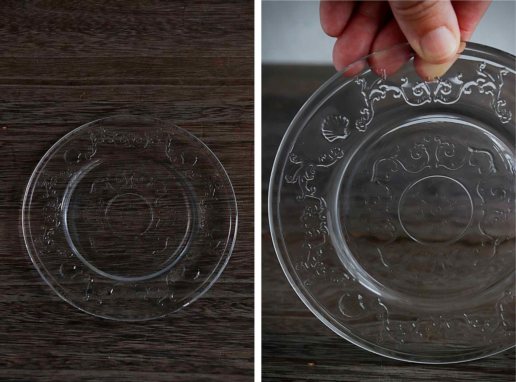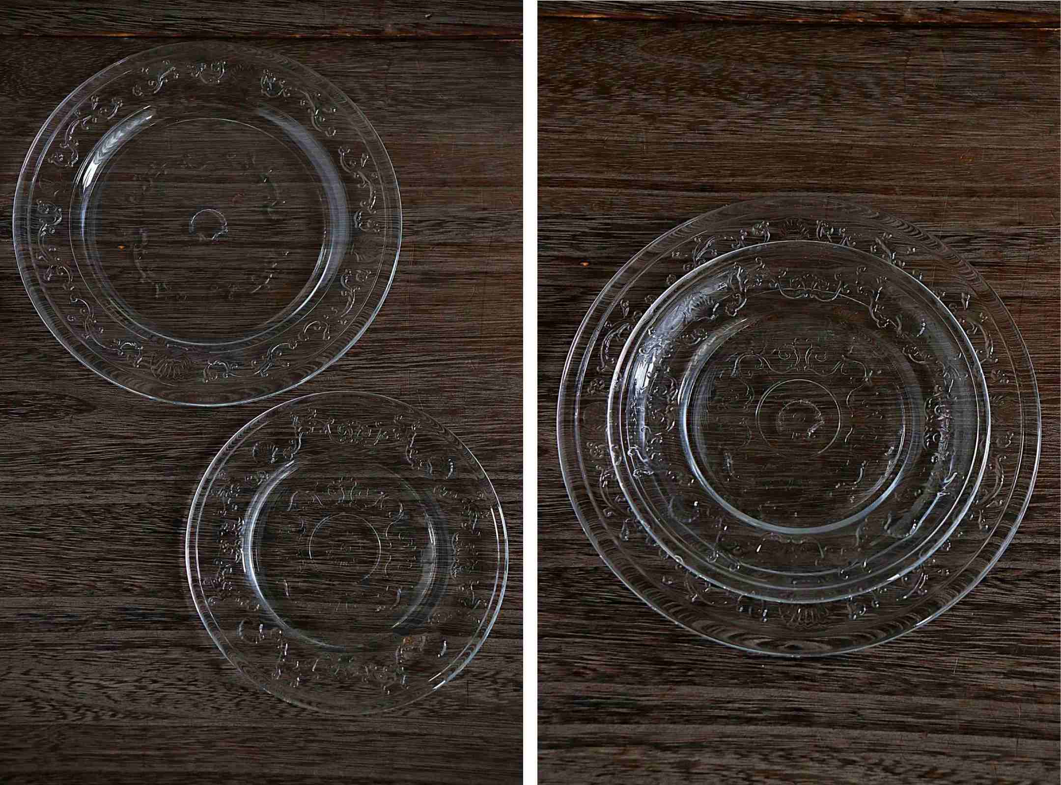 プレート全体には貝殻や花をモチーフにした繊細なレリーフが施されています。 透明なガラスに浮かび上がる模様が、テーブルに上品なアクセントを添えます。